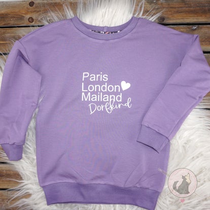 Zeig mit Stolz, wo du herkommst! Unser handgenähter Sweater vereint Komfort mit einer ordentlichen Portion Dorf-Liebe. Der coole Plott mit den Worten „Paris, London, Mailand, Dorfkind“ macht ihn zum perfekten Hingucker – egal ob auf dem Land oder in der Stadt.
