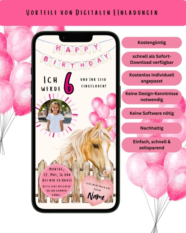 🐴🌸 Liebevoll gestaltete Pferde-Einladung zum Kindergeburtstag – digital & personalisiert
