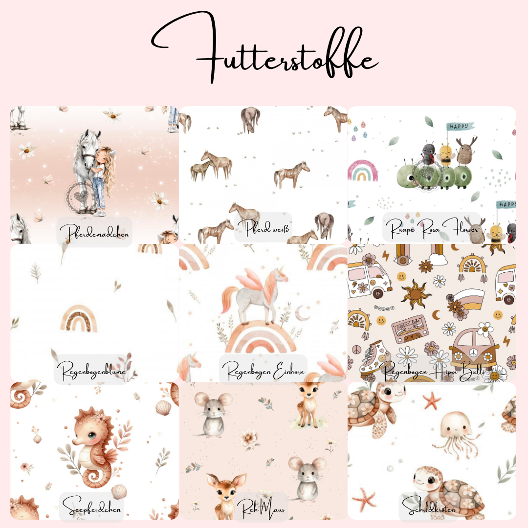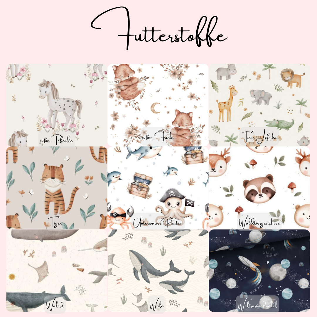 Ich fertige für dich ganz individuell deinen Wunsch-Walkoverall an. Das heißt, du kannst selbst entscheiden, welchen Stoff, welche Farben und welche Knöpfe du möchtest. Die Bündchen wähle ich passend zu deiner Auswahl aus.